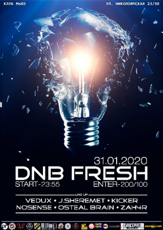 Cедьмая вечеринка DNB FRESH готова предложить вам свежие музыкальные коктейли на любой вкус:) Все ингредиенты под рукой - энергичные сеты от новичков, мастерство и харизма хорошо знакомых диджеев, яркие сочетания бита и баса, сочный саунд и отличное настроение. Отличный способ привнести позитивную нотку в длинные зимние дни!:)